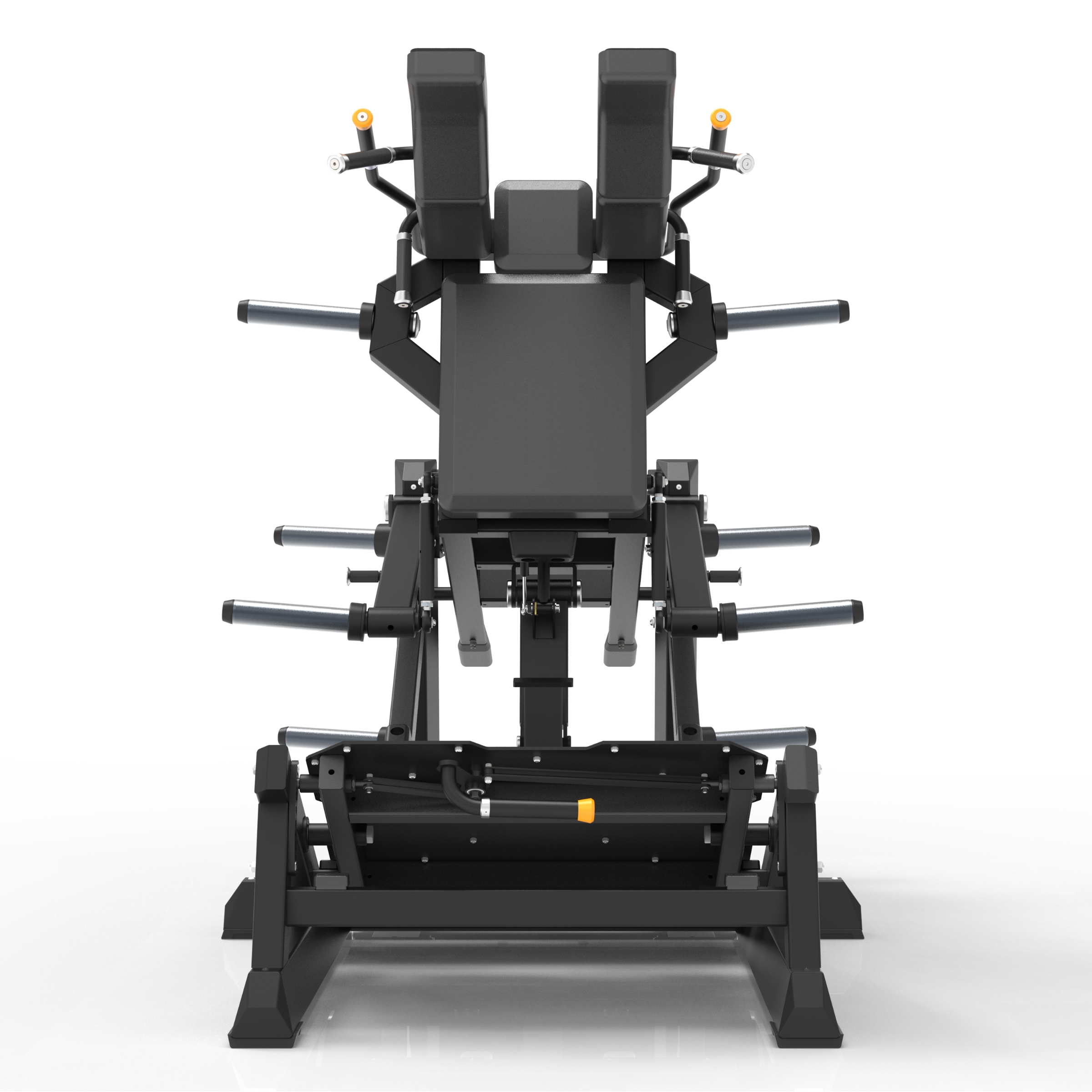Pedales ajustables en 6 ángulos + plataforma amplia (750×665 mm): permite variar la posición del pie para trabajar distintas zonas del cuádriceps, glúteos e isquiotibiales según el objetivo.